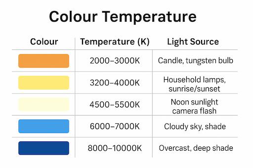 Not all light is “white.” Every light source has its own colour cast, known as its colour temperature, measured in Kelvin (K). Early morning and late afternoon sunlight often appear warm and golden, while midday light looks clean and neutral. On cloudy days or in deep shade, the light turns cooler and slightly blue. Indoor lights also vary — tungsten bulbs give off a rich orange tone, while fluorescent lights may cast a greenish tint.