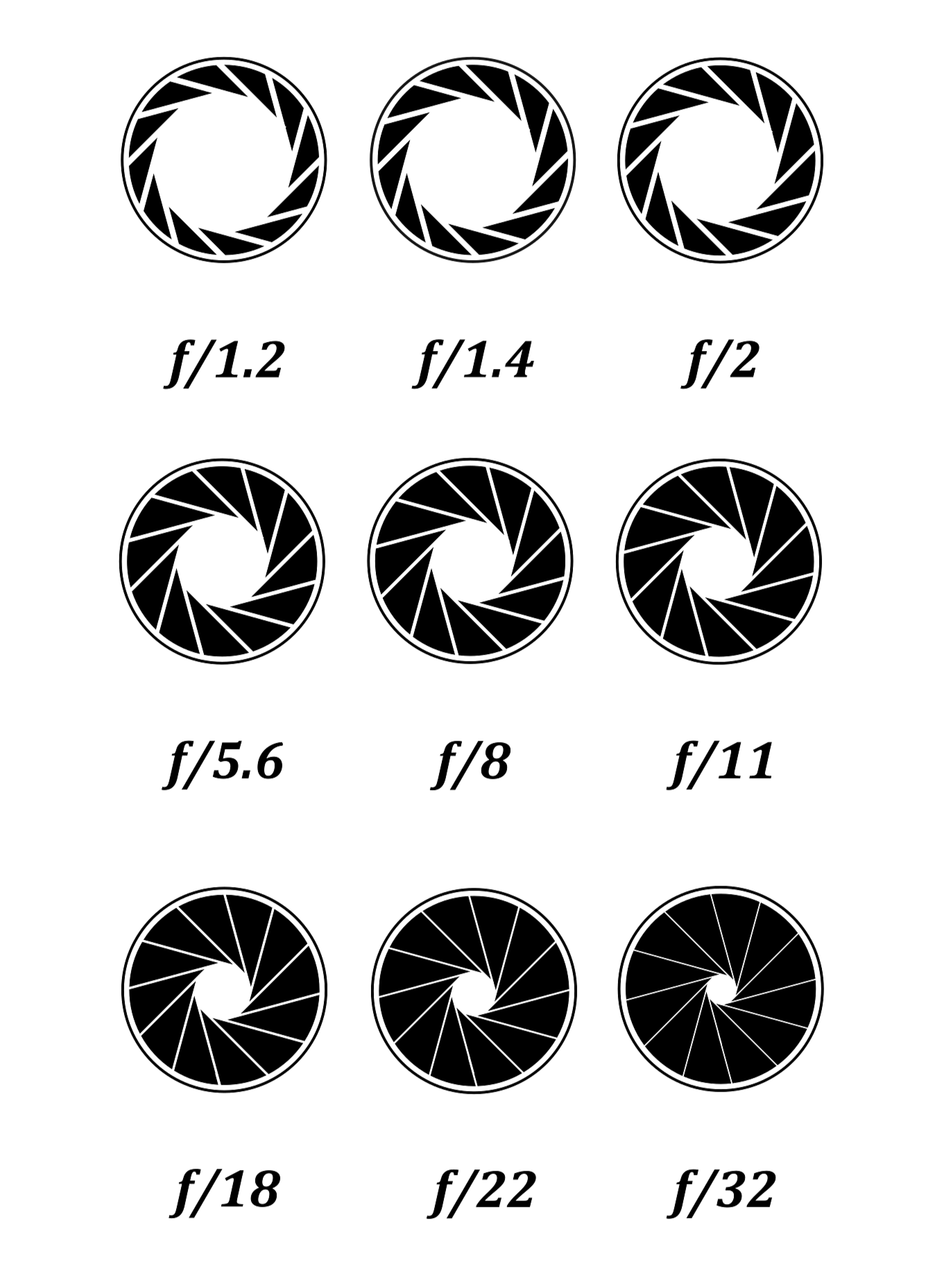 - Measured in f-stops (f/1.8, f/4, f/16).